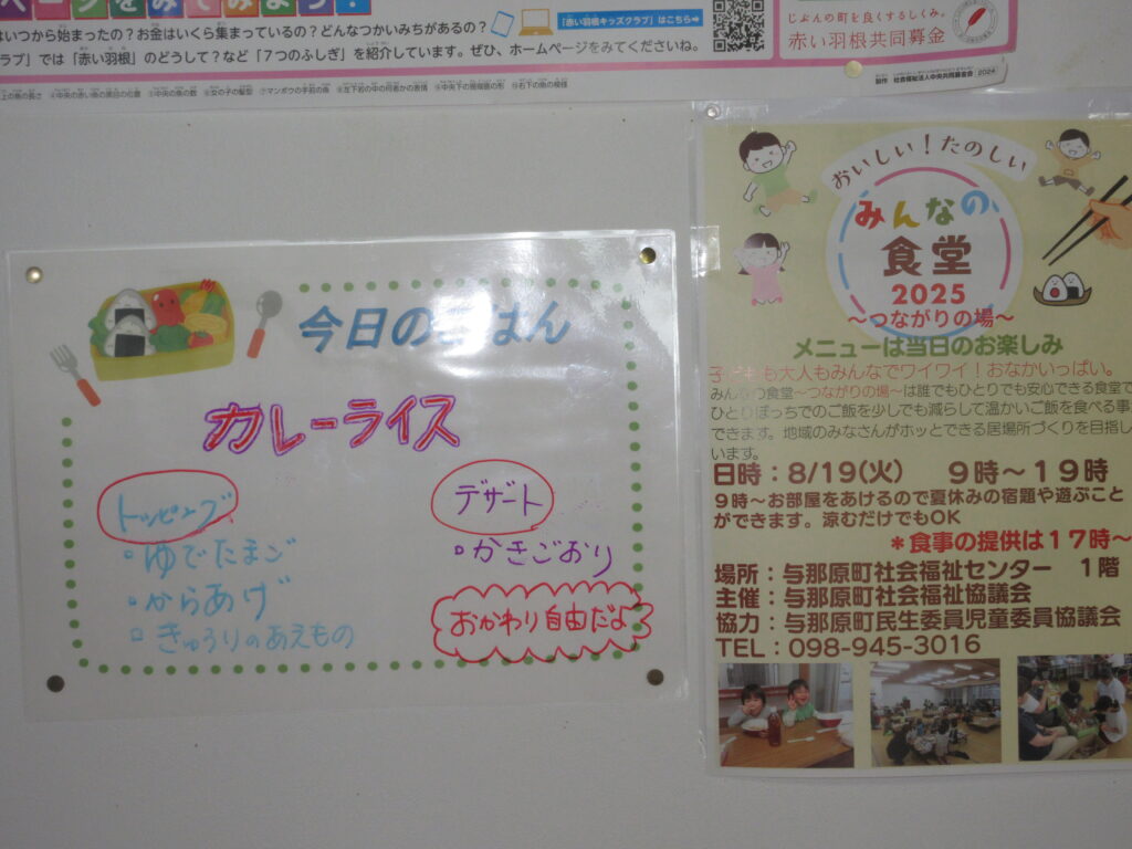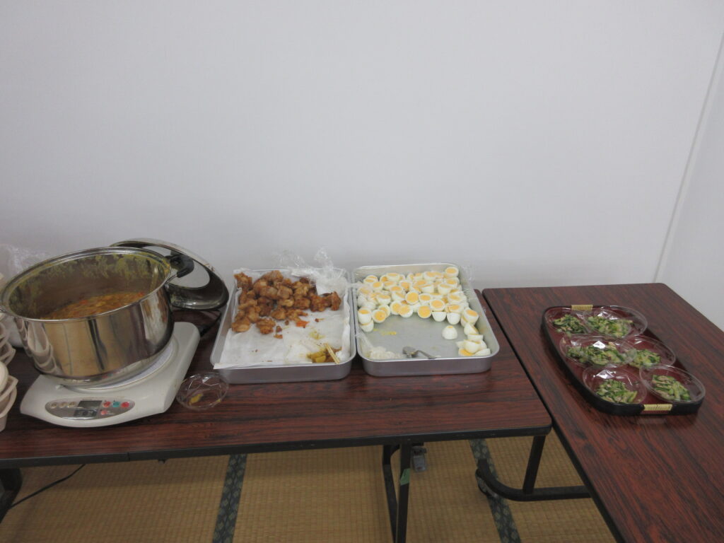8月19日(火)の17時から「みんなの食堂」が開催され、たくさんの方が福祉センターを訪れました。町民生委員児童委員の協力のもと、カレーライス、唐揚げ、ゆで卵、キュウリの和え物が振る舞われ、会場はにぎわいました。
